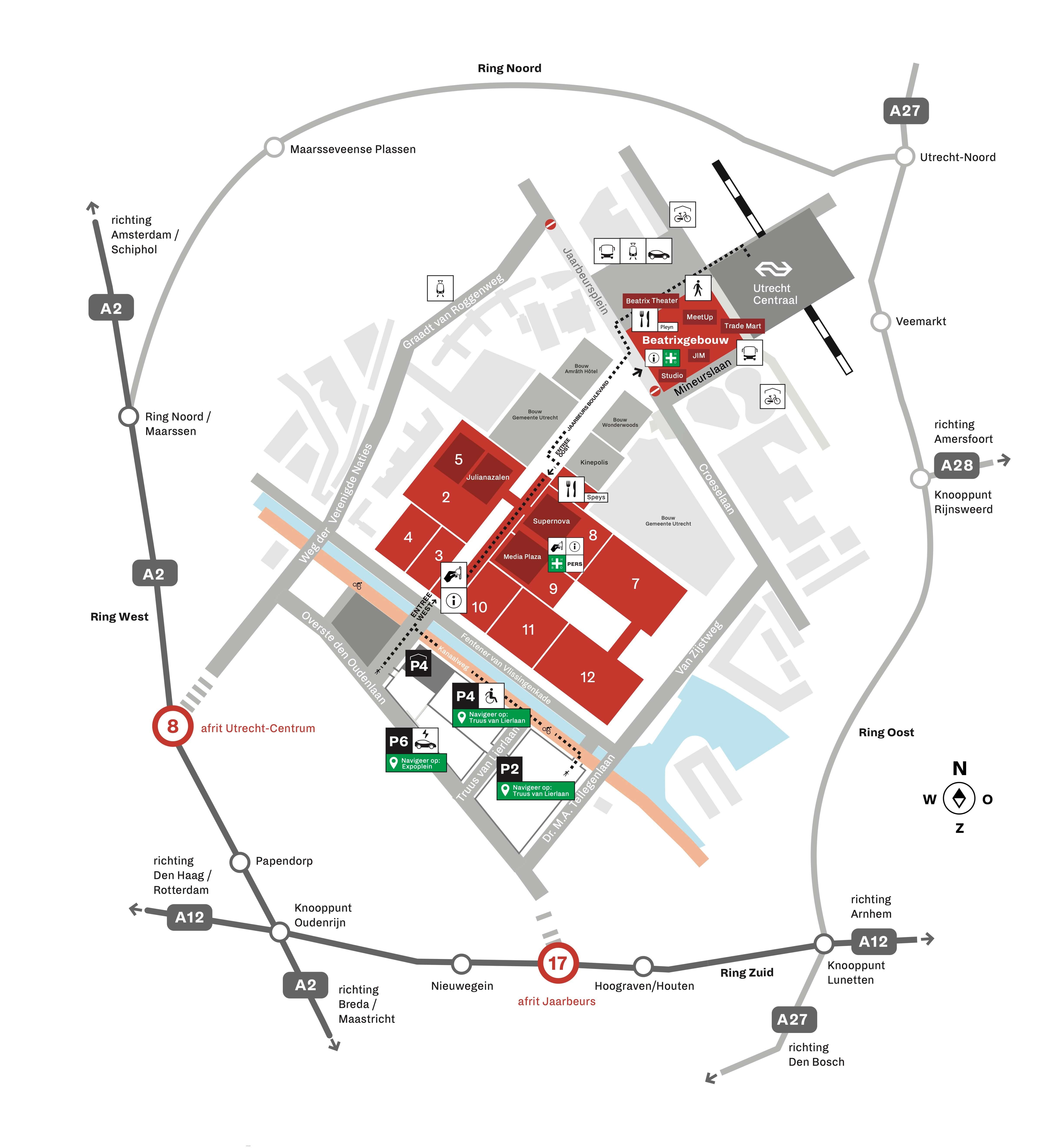 Are you coming by train? Then follow the signs for 'Jaarbeursplein' from Utrecht Central Station. Walk towards the Beatrix Building and cross at Croeselaan.